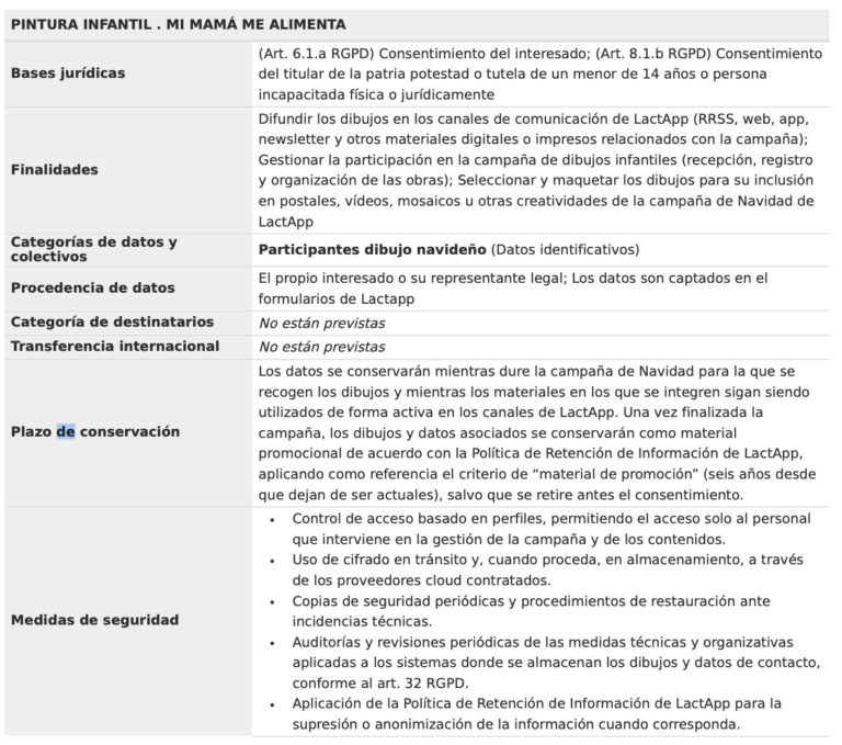Los datos se conservarán mientras dure la campaña de Navidad para la que se recogen los dibujos y mientras los materiales en los que se integren sigan siendo utilizados de forma activa en los canales de LactApp. Una vez finalizada la campaña, los dibujos y datos asociados se conservarán como material promocional de acuerdo con la Política de Retención de Información de LactApp, aplicando como referencia el criterio de “material de promoción” (seis años desde que dejan de ser actuales), salvo que se retire antes el consentimiento.